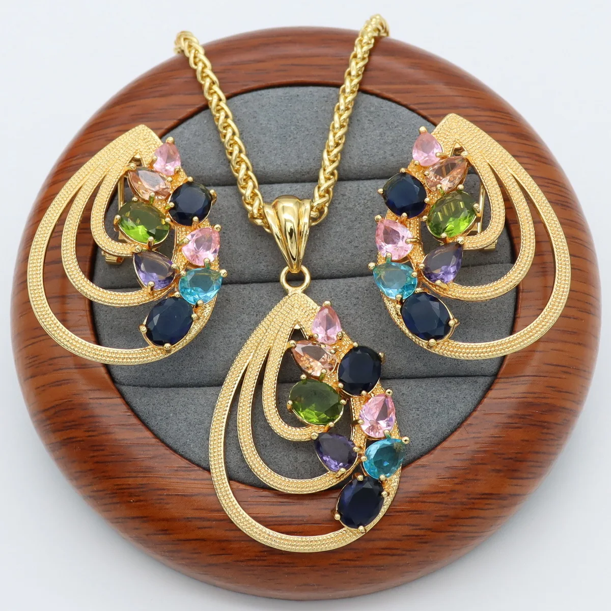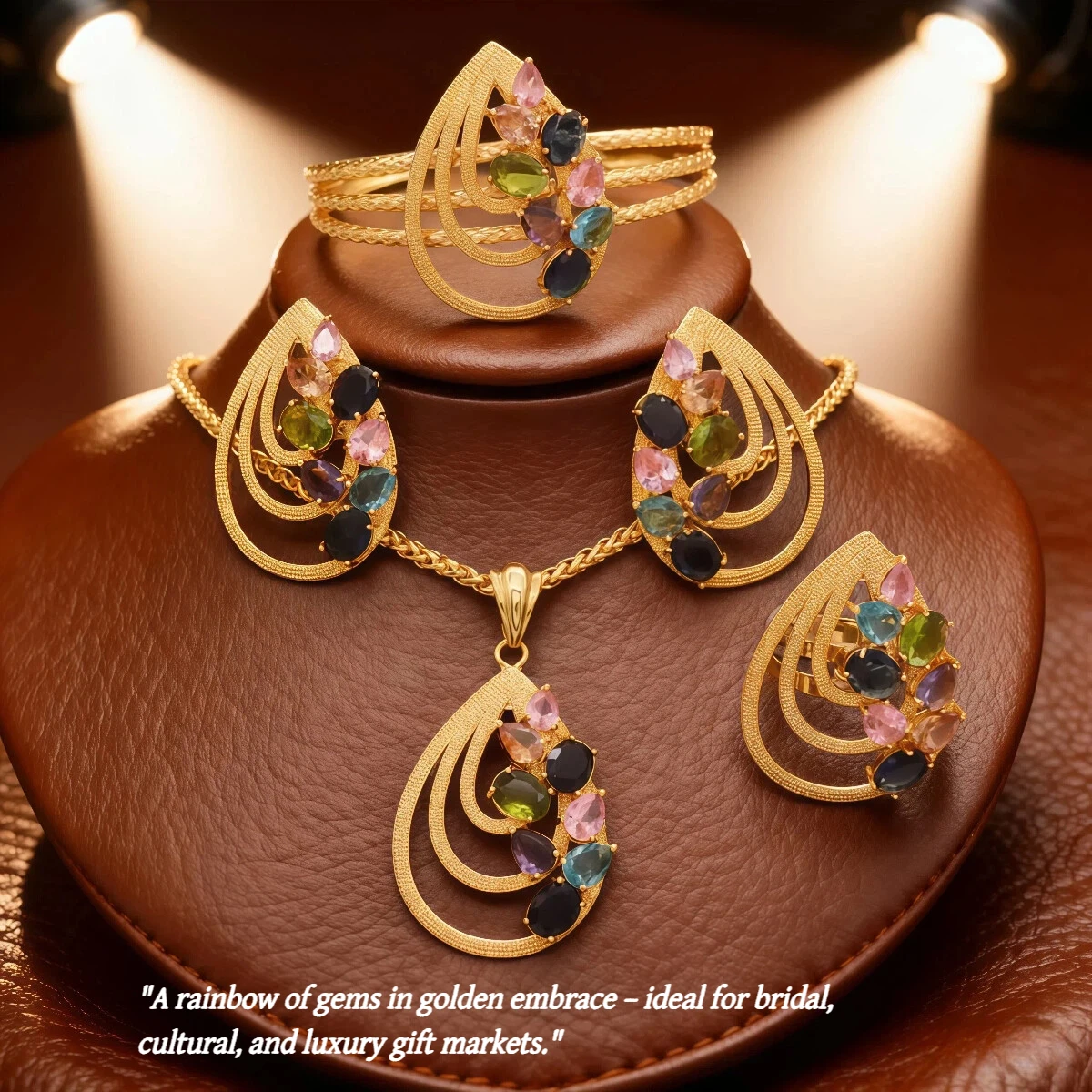 Vibrant colorful gemstone bridal jewelry set. Includes necklace and earrings, ideal for weddings, parties, or gifting.