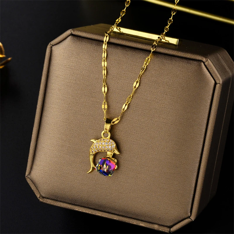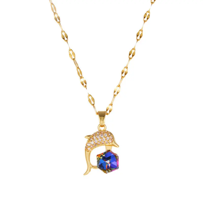 Playful crystal dolphin necklace in stainless steel. Ideal for ocean lovers, daily wear, or gift jewelry.