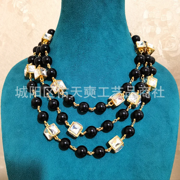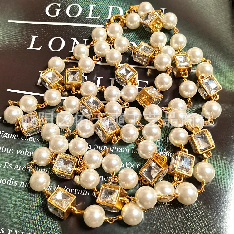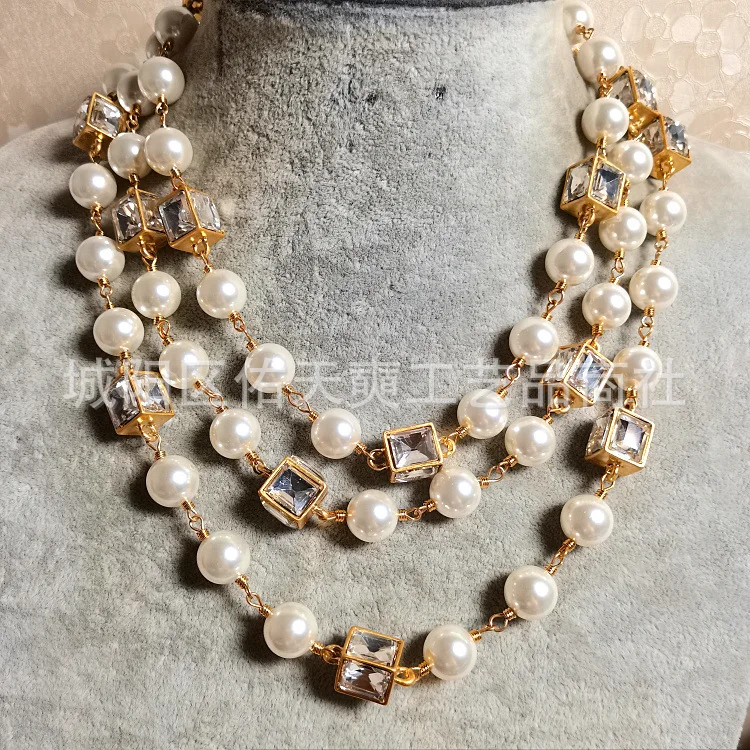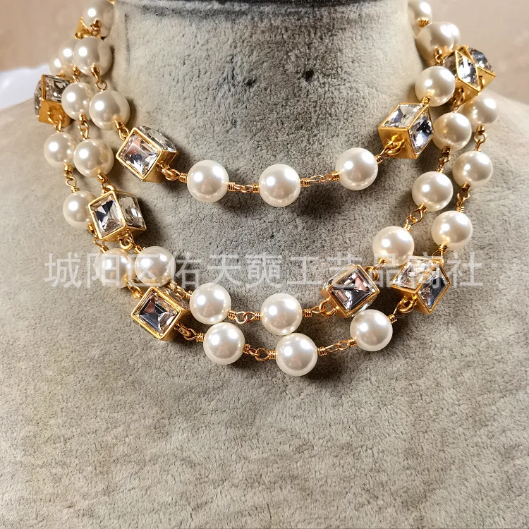 European American multi-layer pearl necklace. Long beaded chain design perfect for elegant parties, weddings, or gifting.