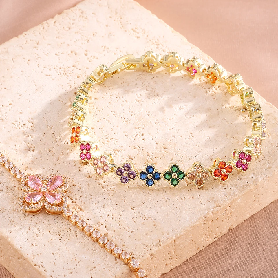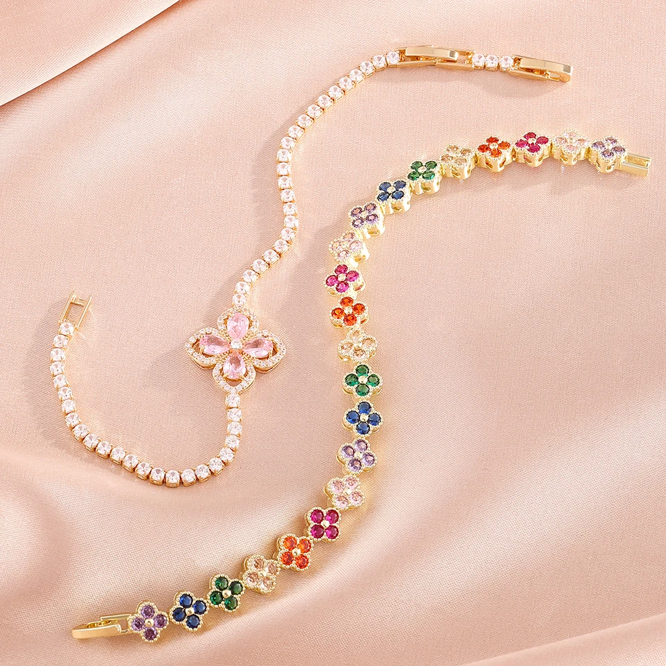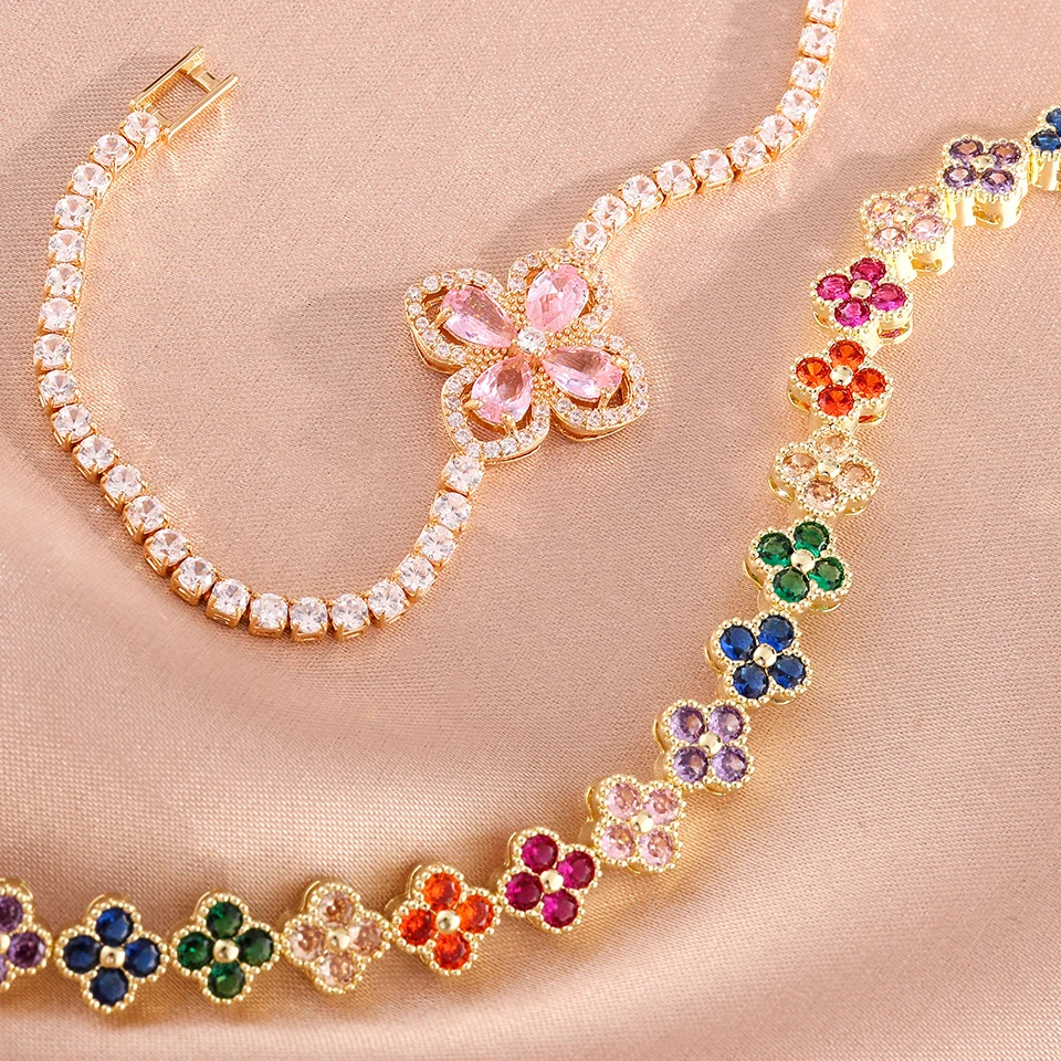 Elegant four-leaf clover zircon bracelet set for women. Stylish and lucky jewelry ideal for daily wear or gifting.