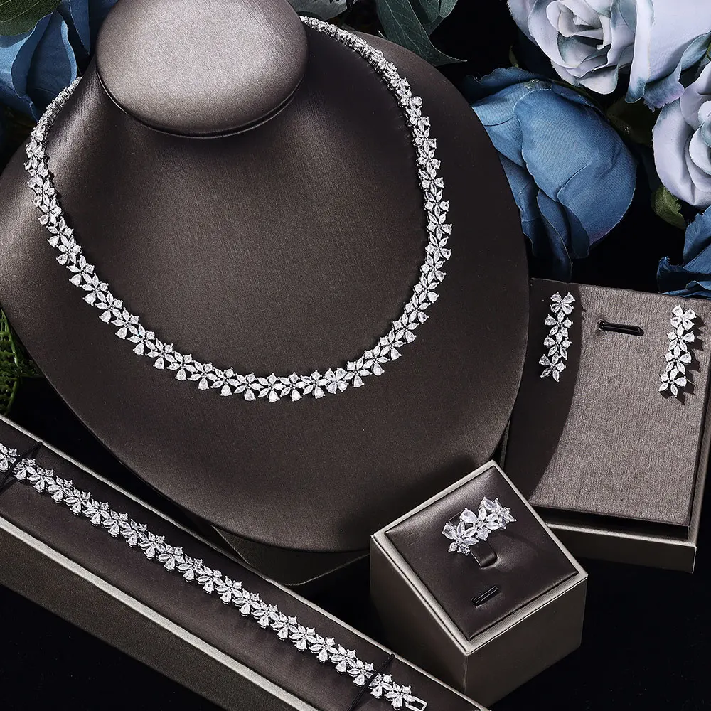 Turn every moment into a celebration with this Four-Piece CZ Bridal Jewelry Set, inspired by elegant Dubai crystal designs. This stunning set includes a matching necklace, earrings, bracelet, and ring, all beautifully decorated with sparkling cubic zirconia (CZ) stones that catch the light from every angle.