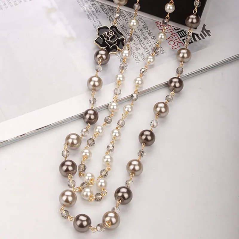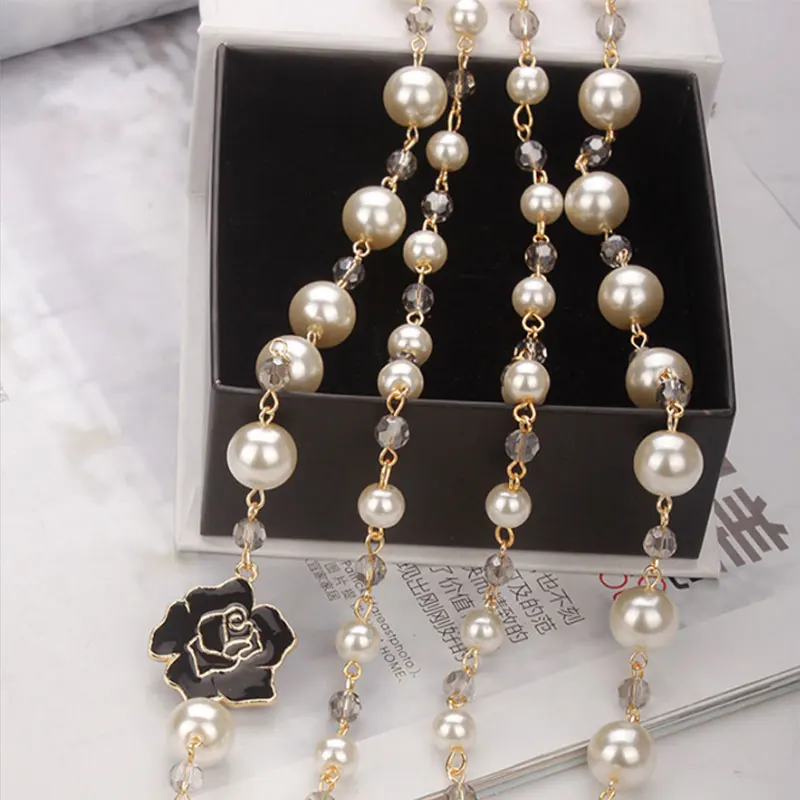 Trendy Korean-style long necklace featuring camellia-inspired pearls. Elegant and versatile, ideal for fashion-forward outfits and layering.