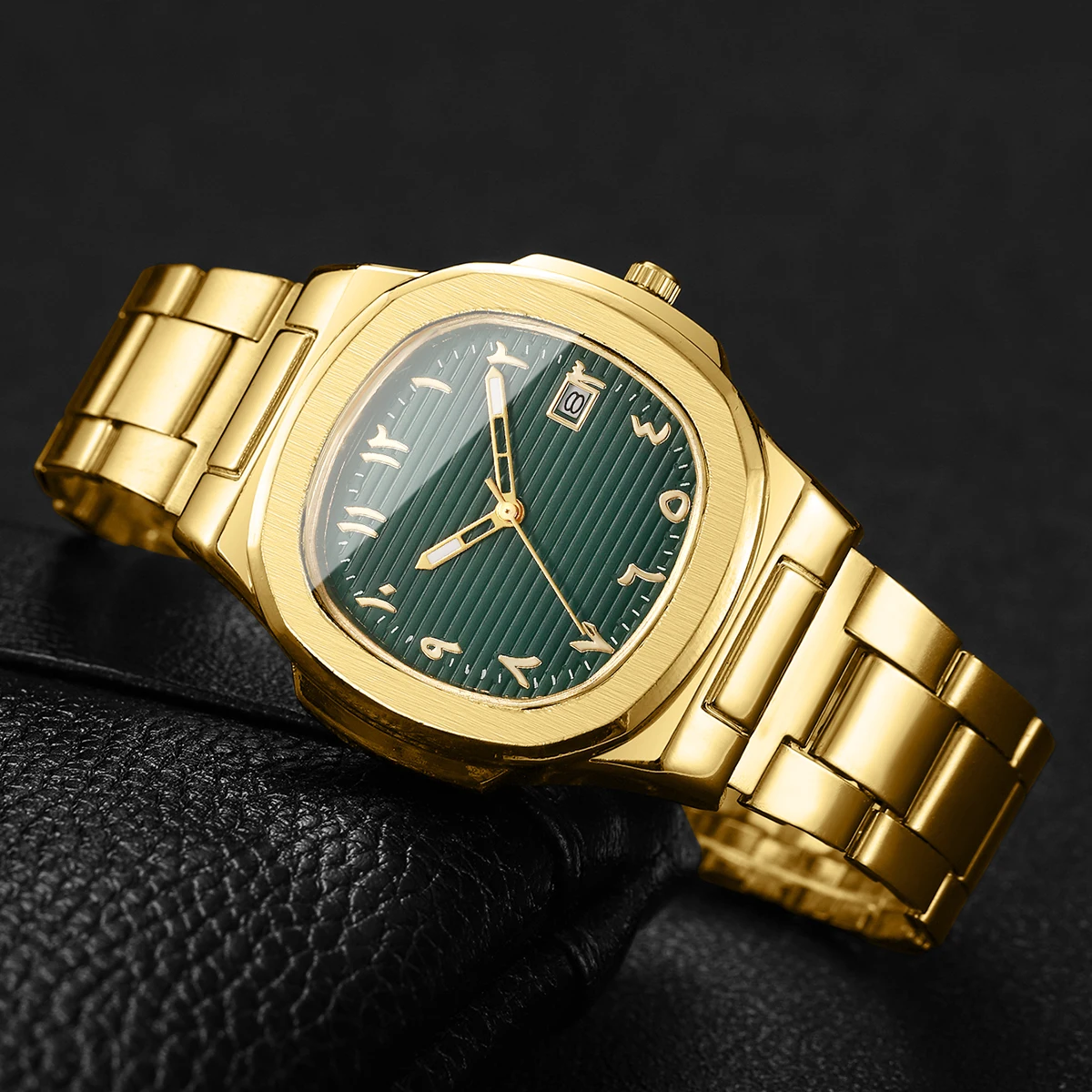 Sophisticated men’s square dial quartz watch featuring a calendar function. Ideal for professional and business settings.