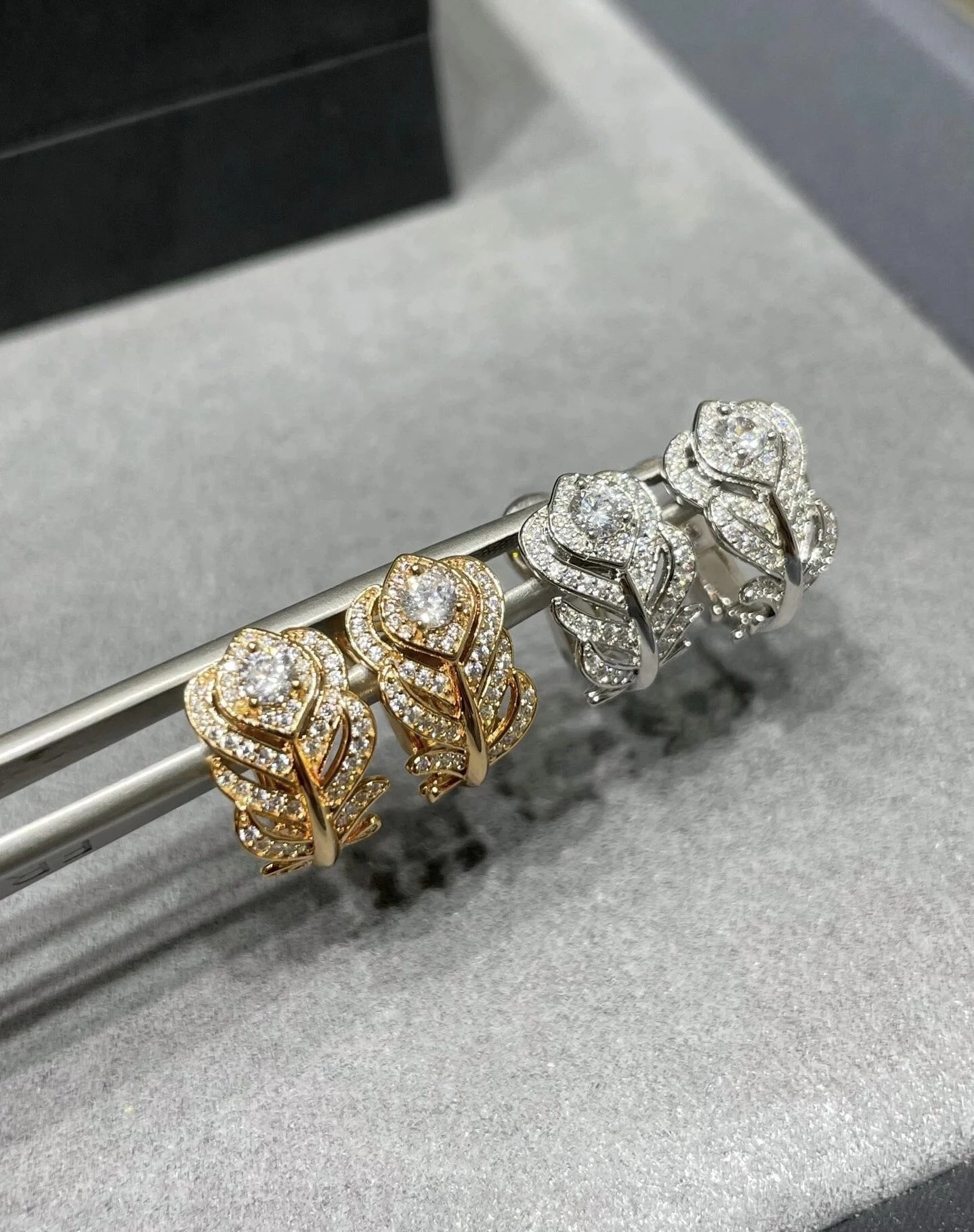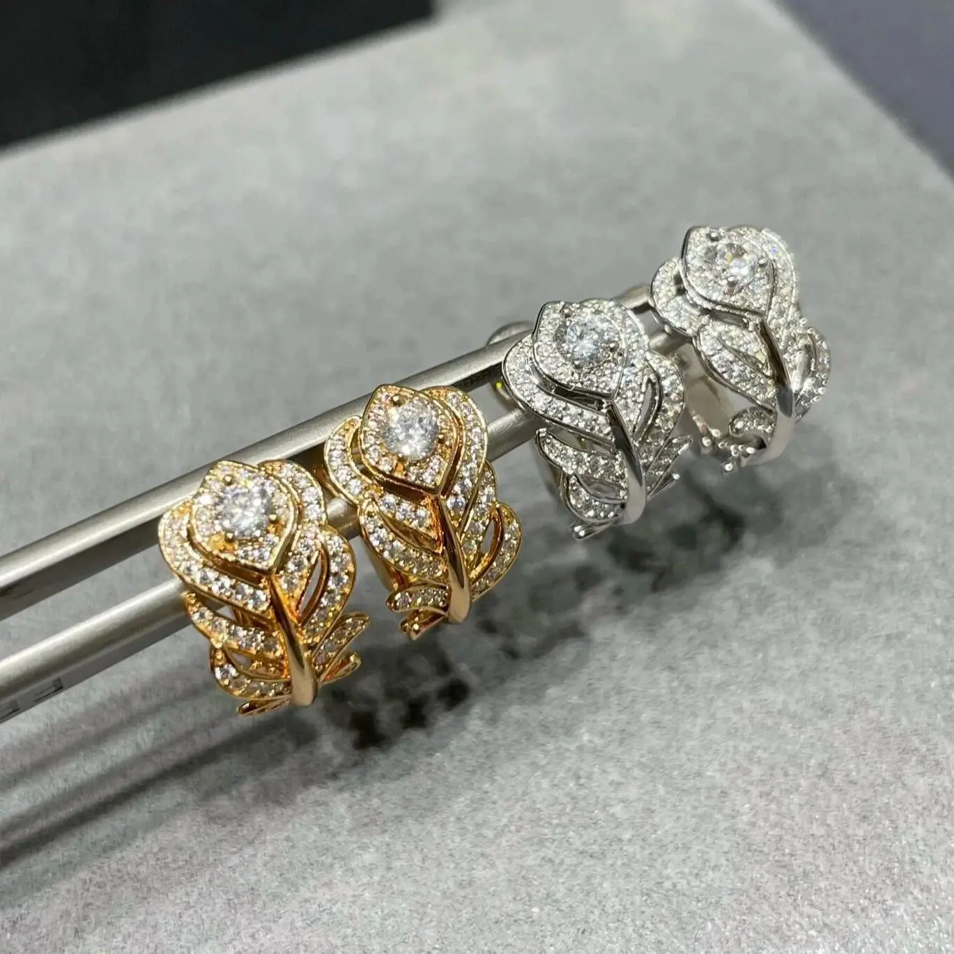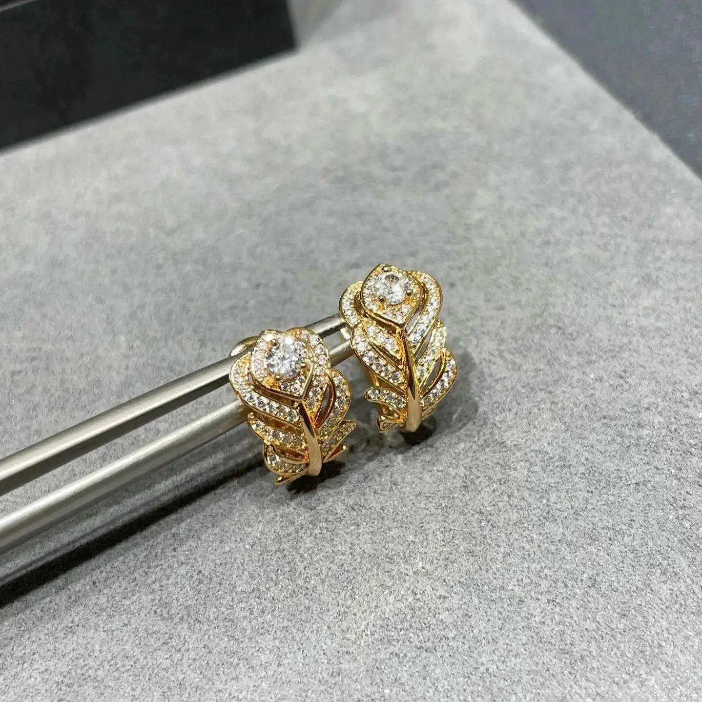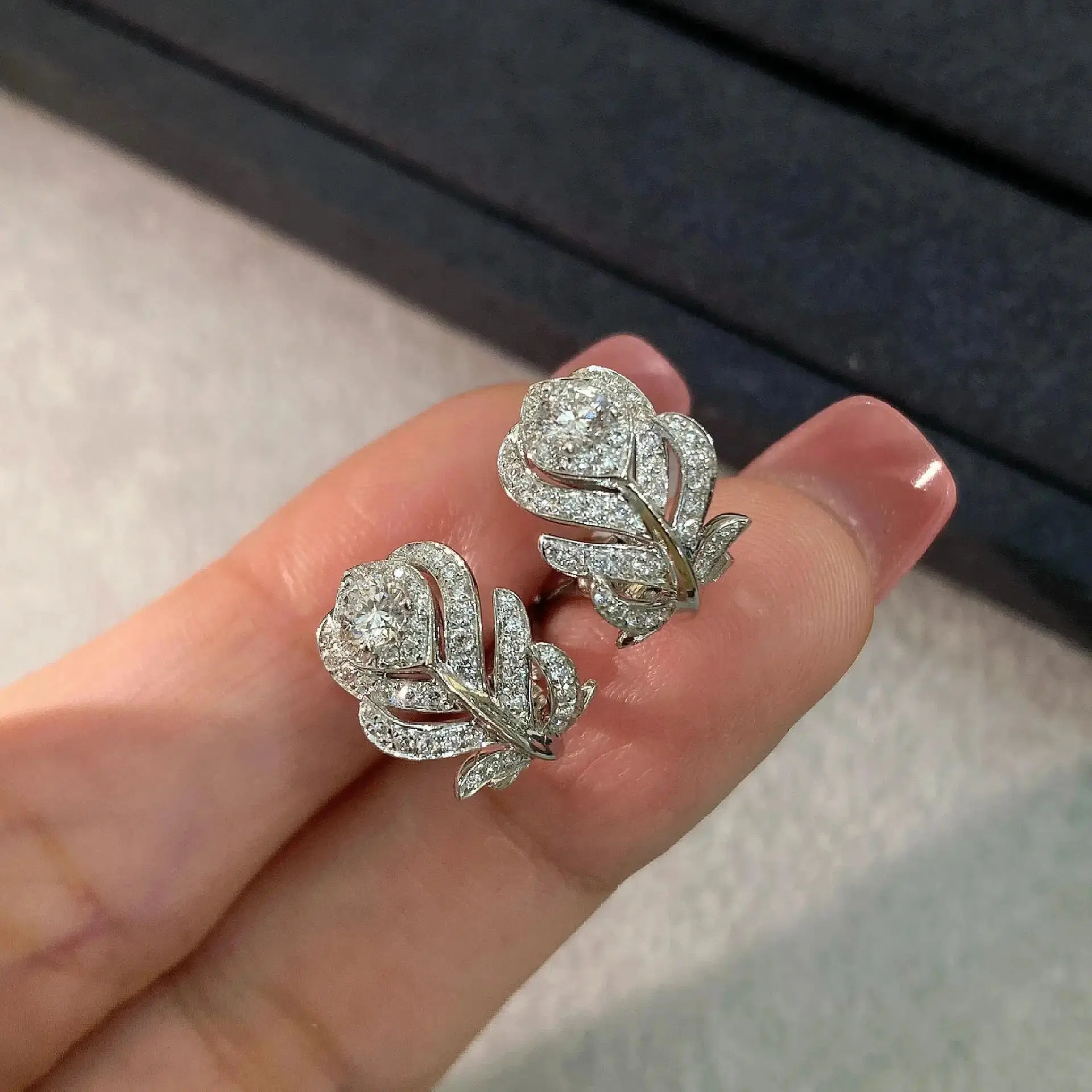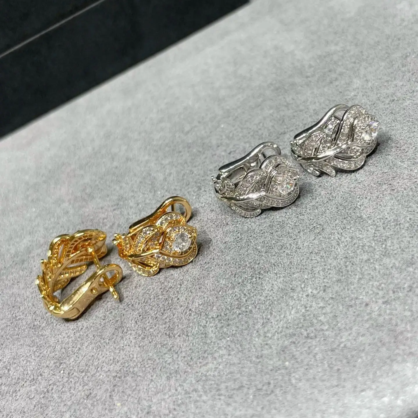 Moissanite feather ear clip earrings. Delicate, elegant design with sparkling moissanite stones.