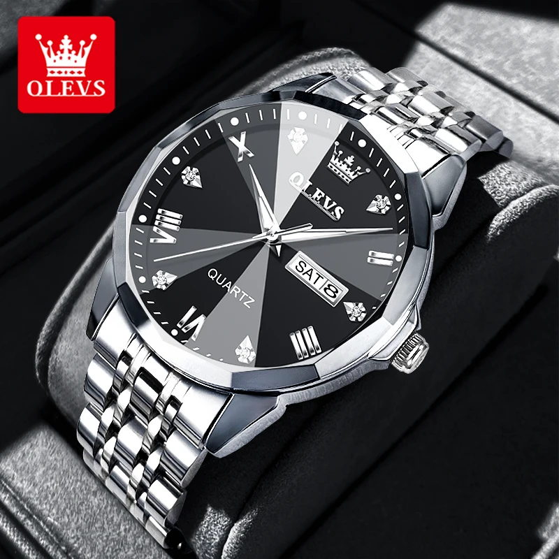 Durable OLEVS stainless steel quartz men’s watch. Sleek, versatile design suitable for formal or casual occasions.