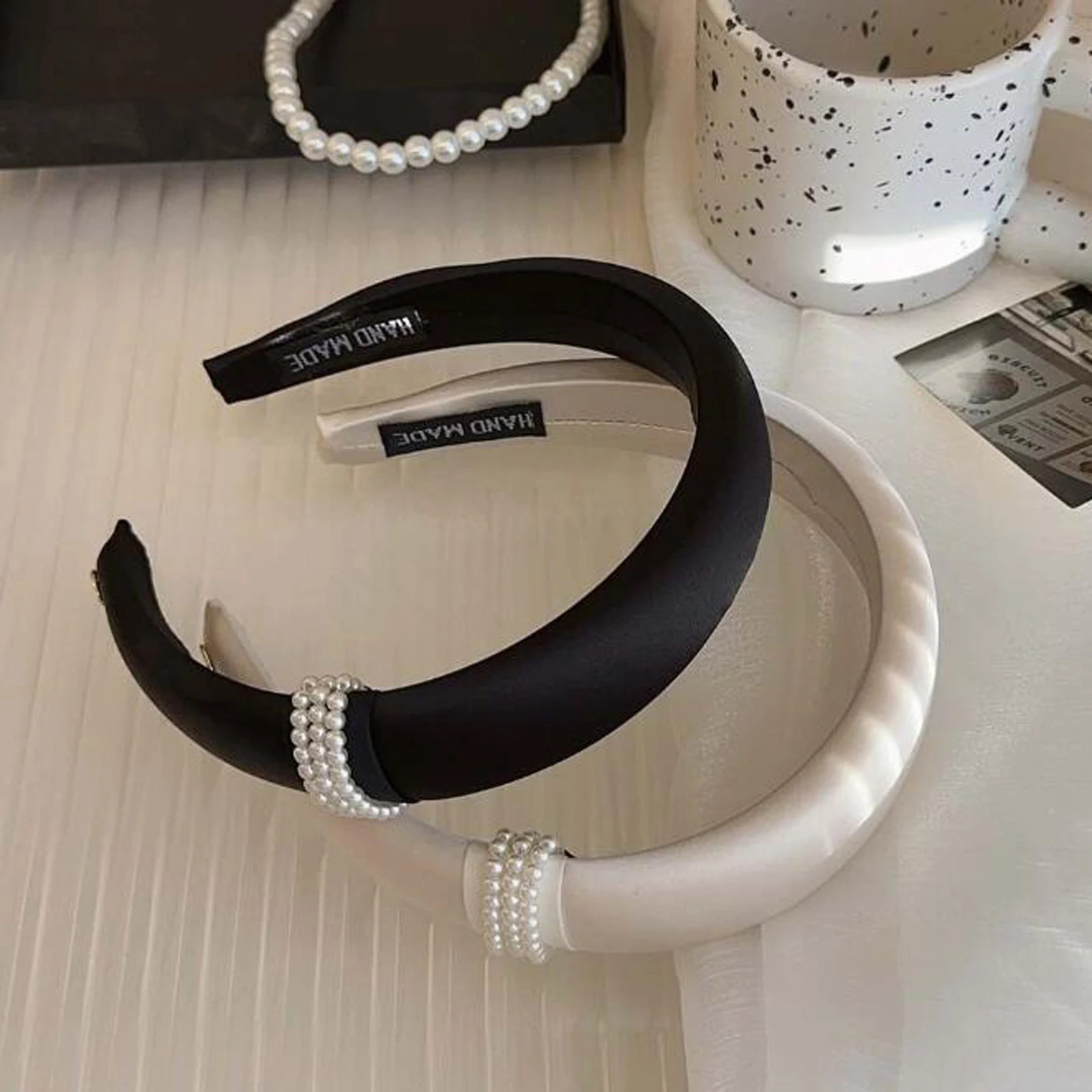 beige hairband, black hairband