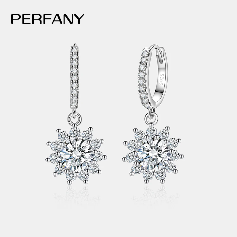 Chic PERFANY sunflower-shaped Moissanite drop earrings. Unique, elegant accessory for weddings, parties, or gifting.