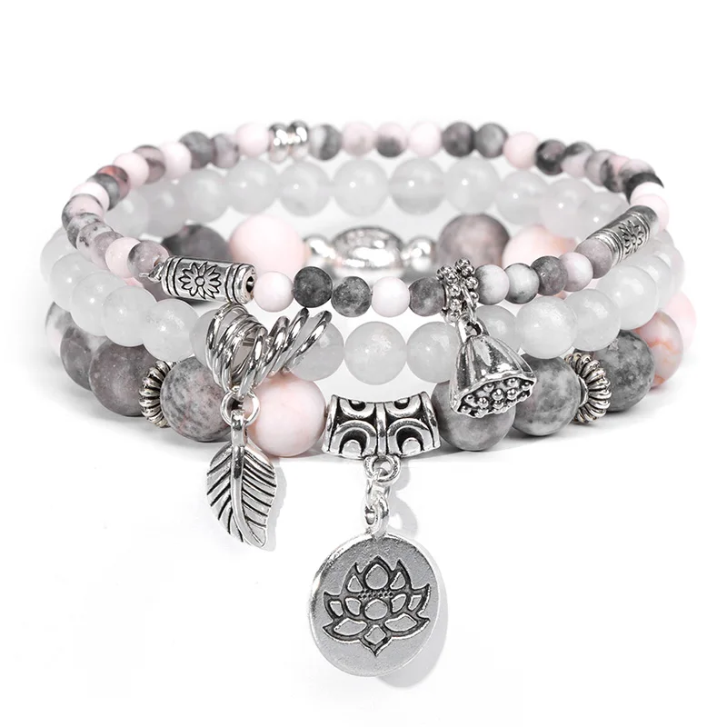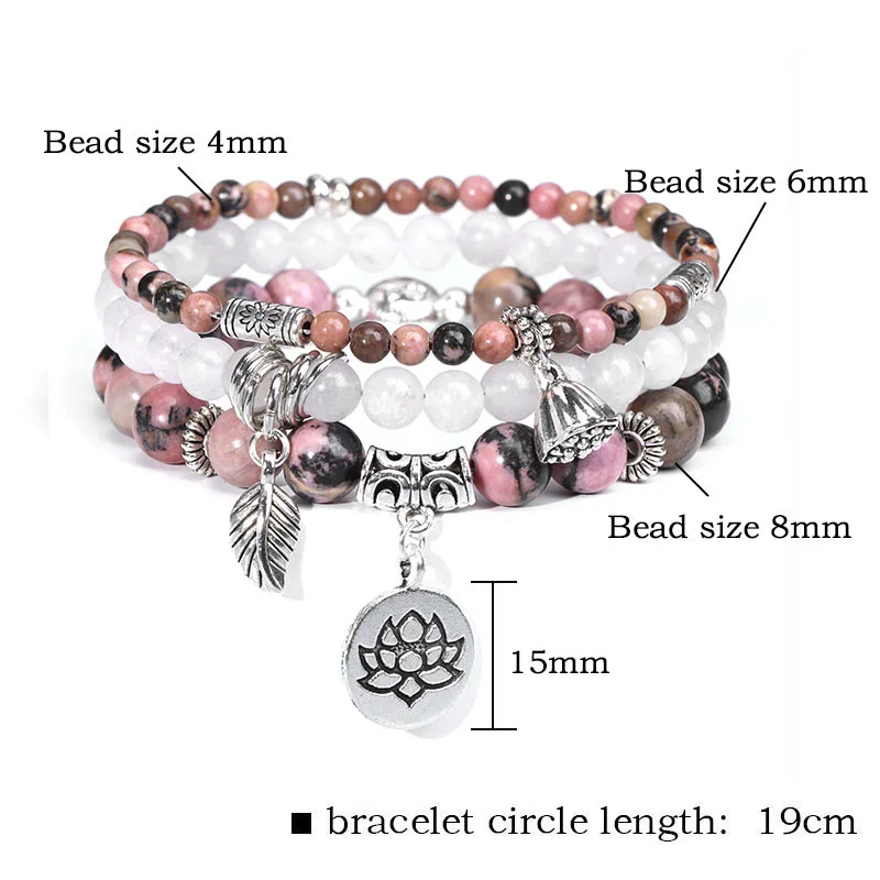Chic pink quartz bracelet set with lotus charms. Perfect boho-style jewelry for stacking, casual wear, or gifting.