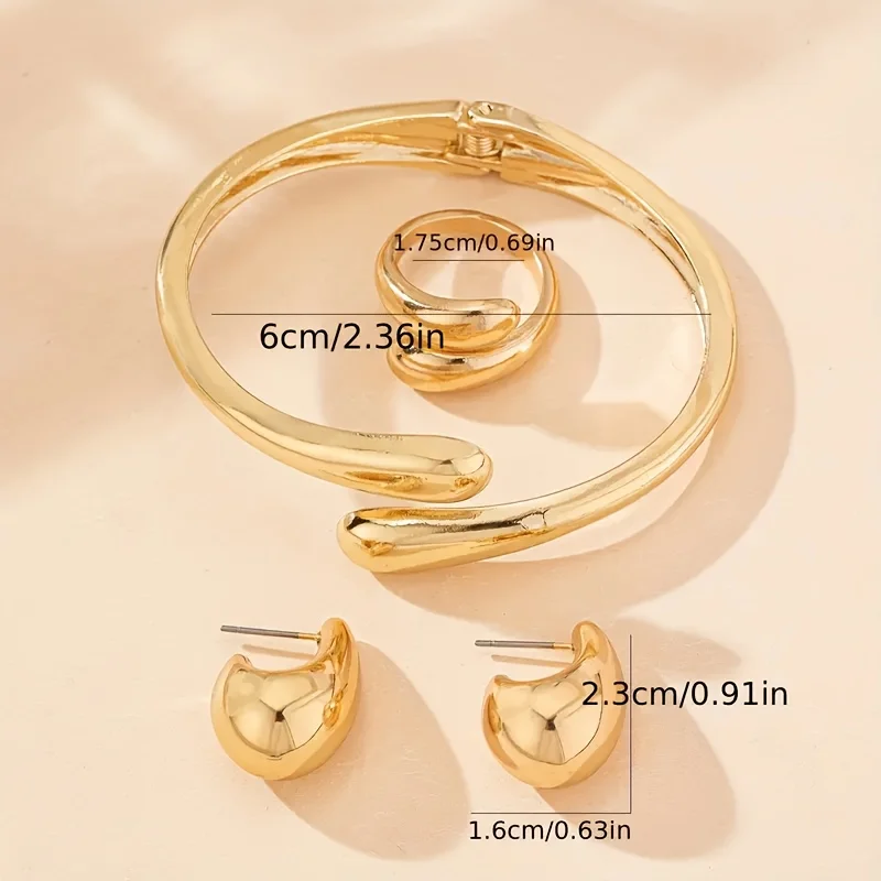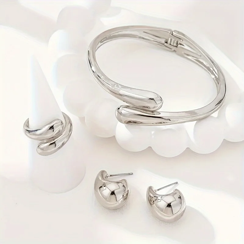 Add a bold and modern touch to your style with this Punk Water Drop Jewelry Set. Designed for women who love edgy fashion, this set includes a unique open spring bracelet, matching ring, water drop earrings, and bangle, creating a coordinated and eye-catching look.
