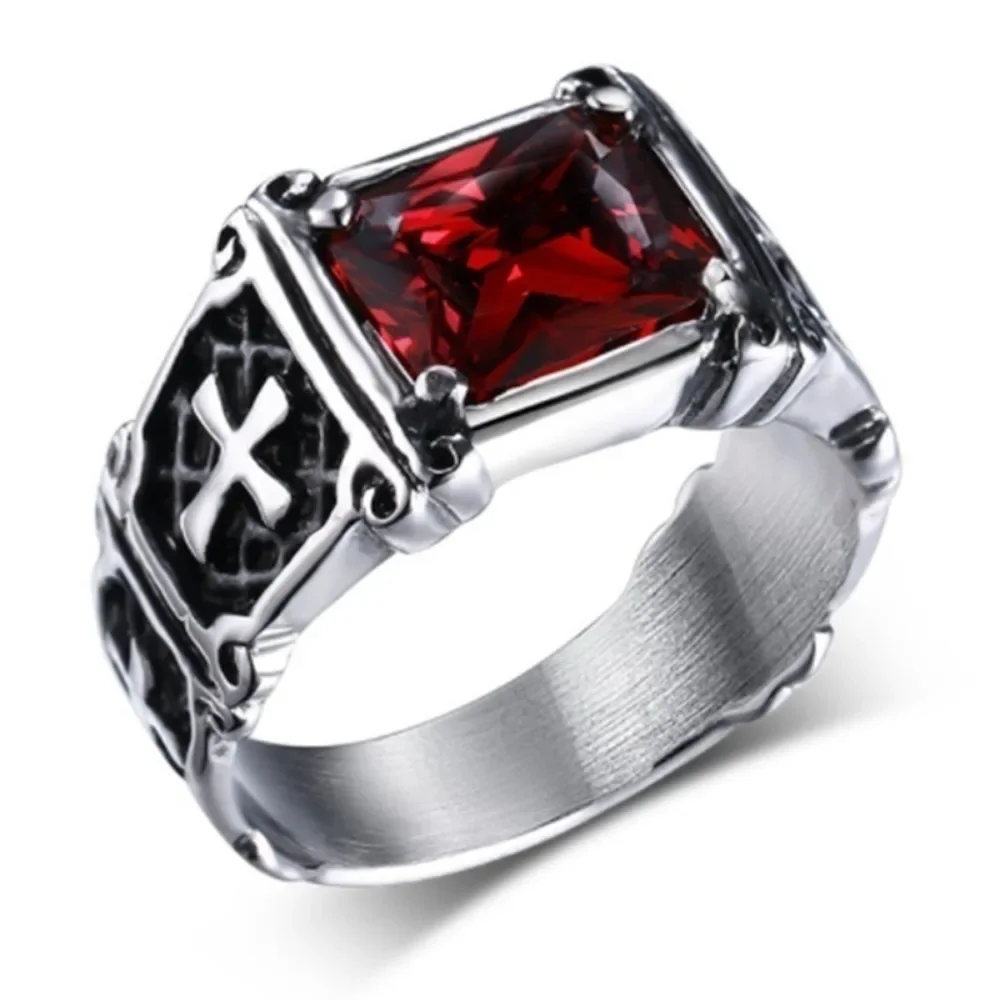 Retro-inspired cross ring set with a vivid red gemstone. A bold vintage statement piece perfect for punk, gothic, or classic fashion lovers.