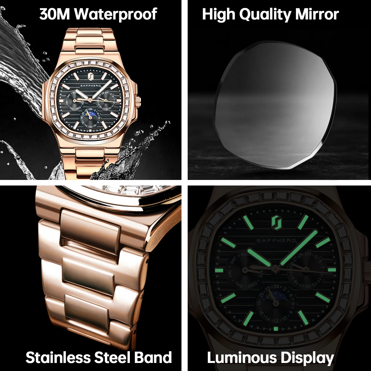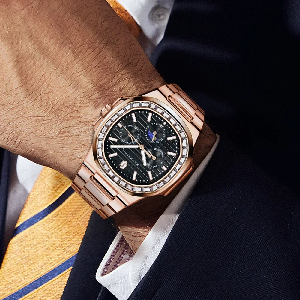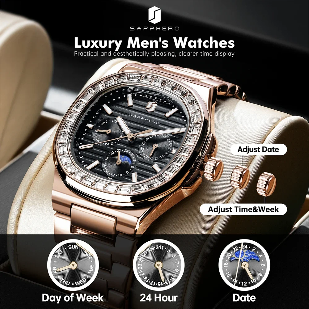 Sophisticated SAPPHERO men’s rose gold quartz watch. Waterproof design with luxurious finish—ideal as a premium gift.