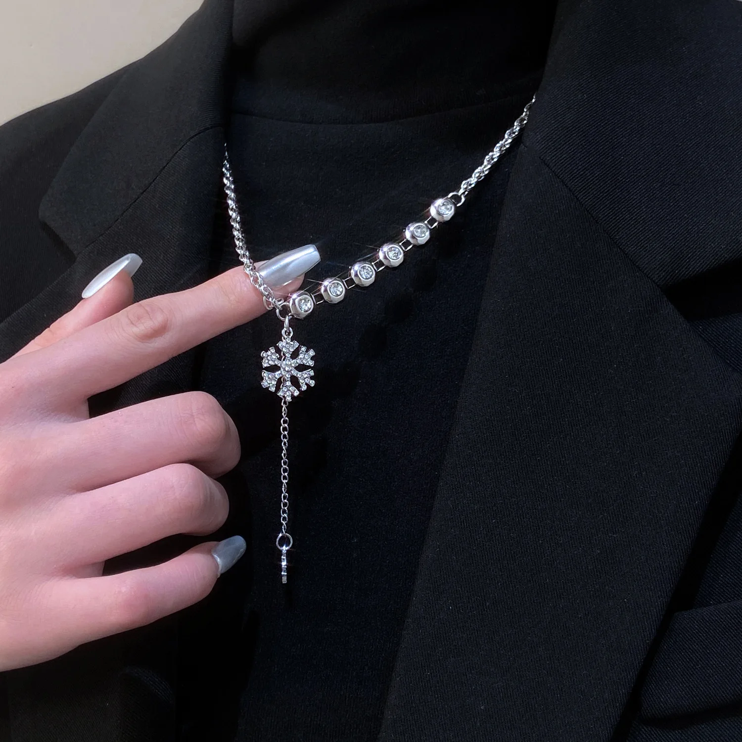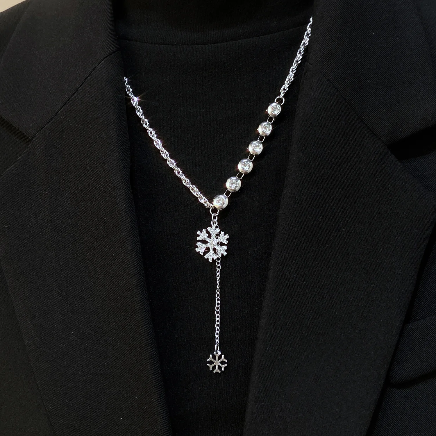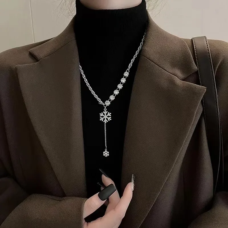 Elegant snowflake tassel necklace adorned with sparkling diamond accents, perfect for winter style, parties, and luxury fashion looks.