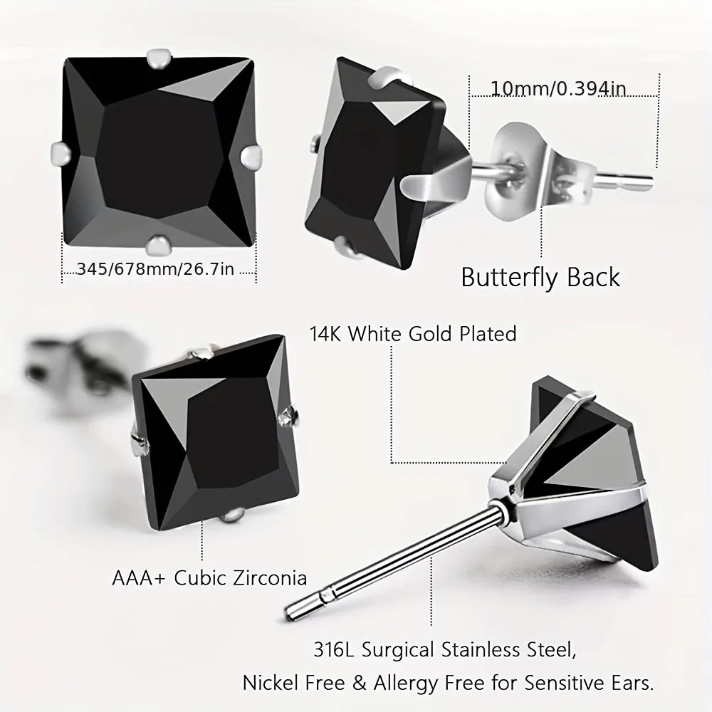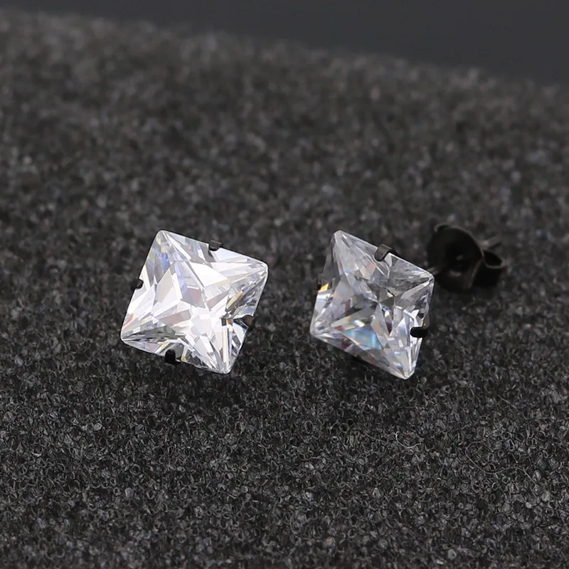 Classic square CZ stud earrings in stainless steel. Elegant unisex design suitable for daily wear or gifting.