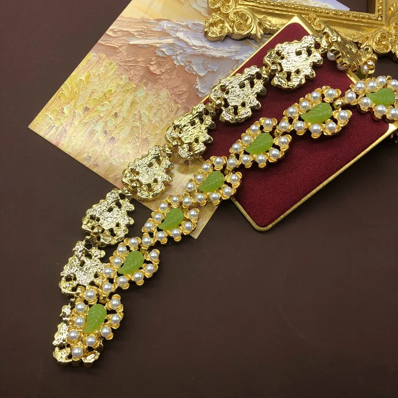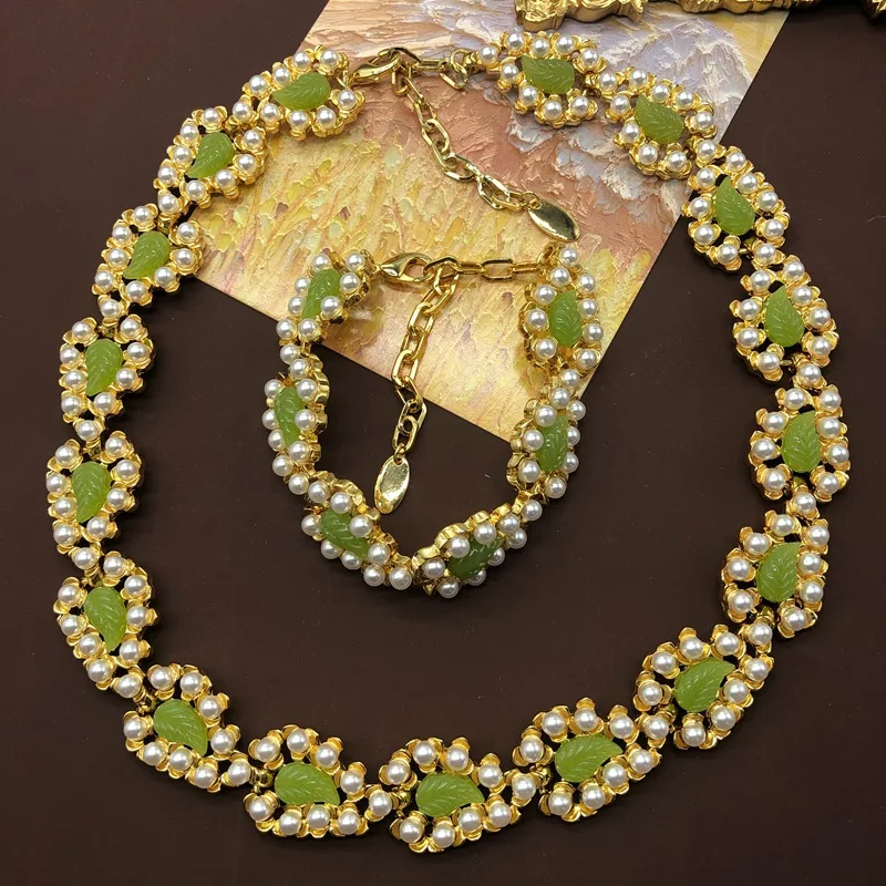 Vintage leaf gold-plated necklace and bracelet pearl set. Classic, elegant design ideal for weddings or formal events.