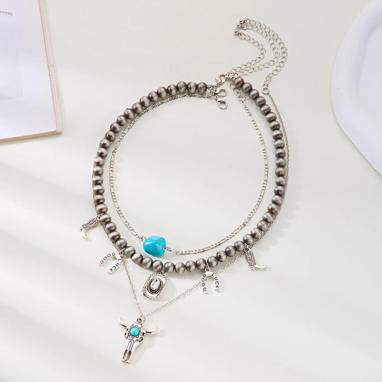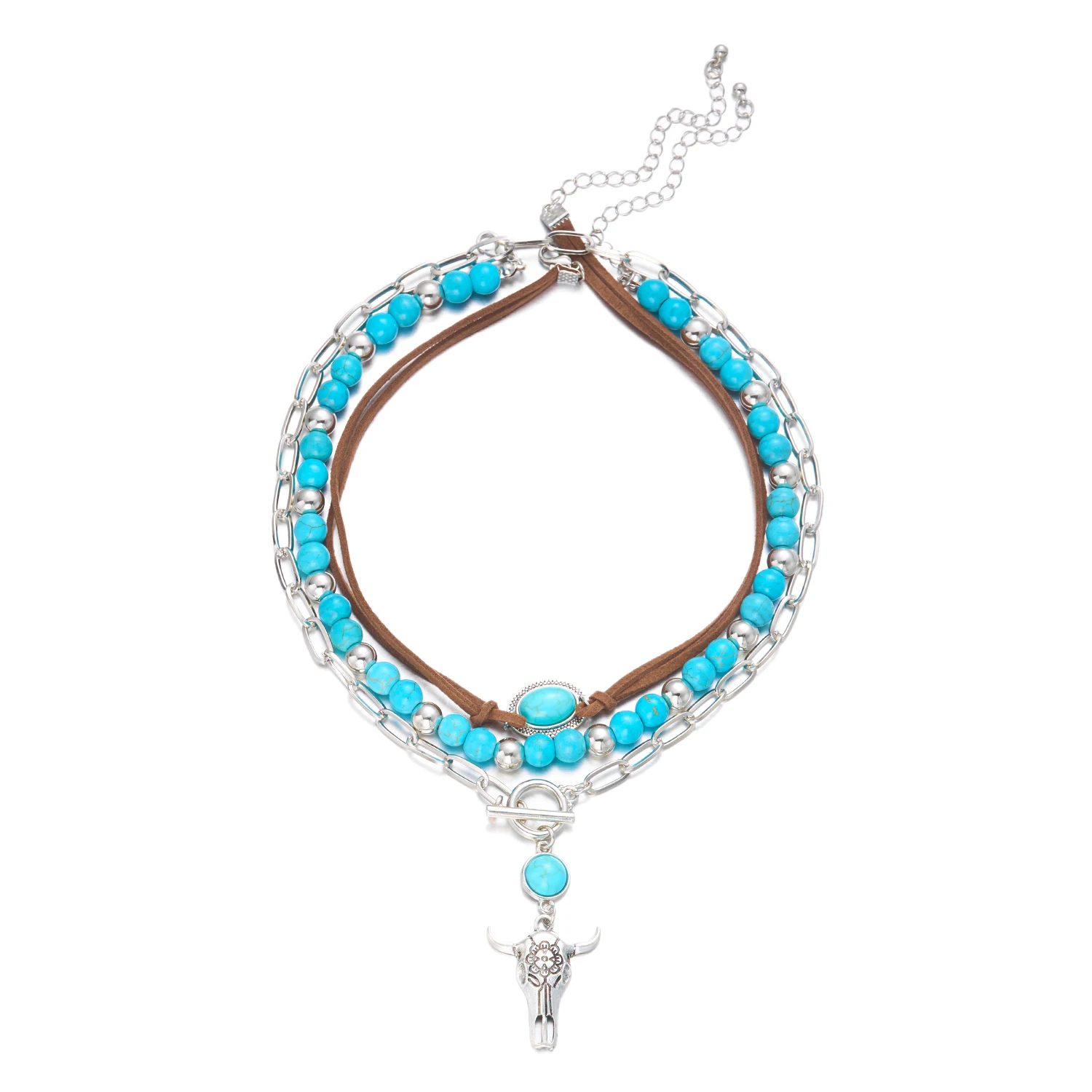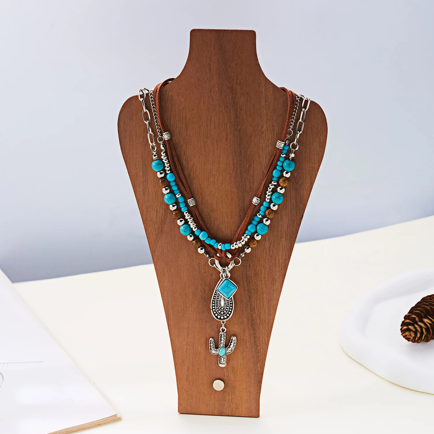 Bold western-style turquoise cowboy pendant necklace. Ideal statement accessory for casual, festival, or boho fashion.
