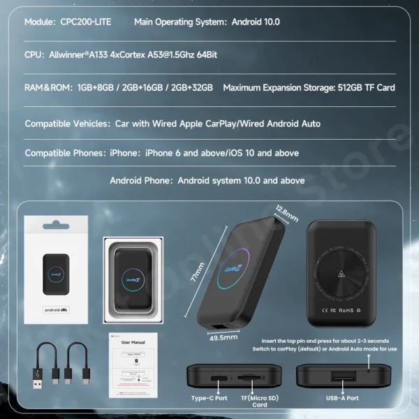 - Support Head Unit: Wired CarPlay or Wired Android Auto
