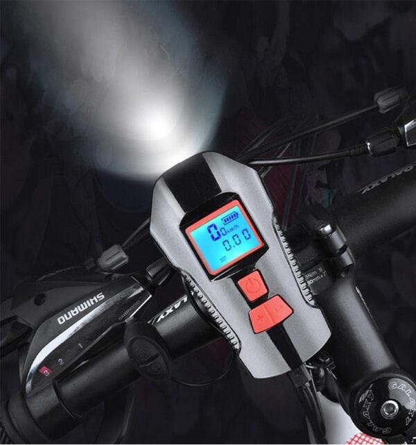 Bike front light, illuminate your way through any adventure with our Waterproof Bicycle Light. This multitasking marvel not only brightens your path but also comes equipped with a horn, speed meter, and an easy-to-read LCD screen for added convenience and safety.