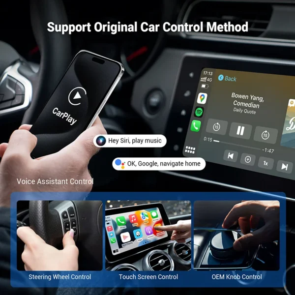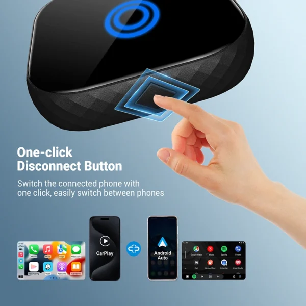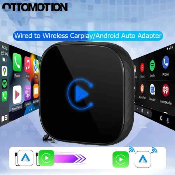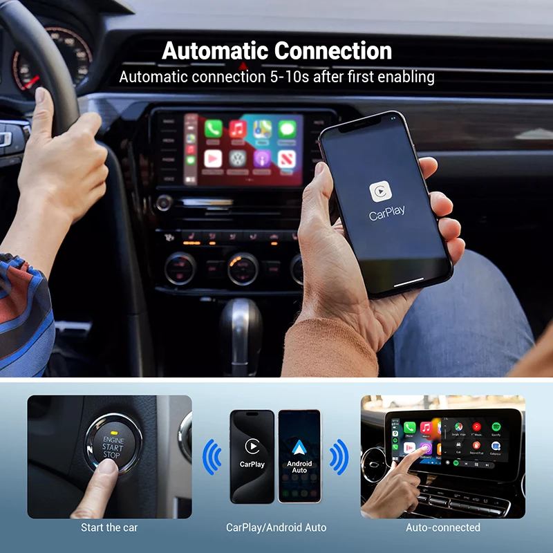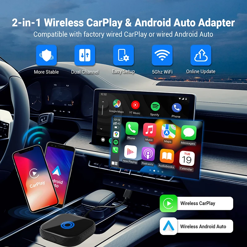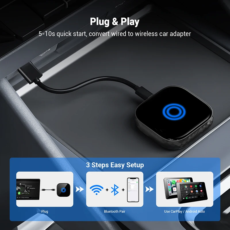Wireless CarPlay Adapter | Effortless Connectivity for Apple CarPlay & Android AutoNote: please make sure the car has wired CarPlay and Wired AndroidIf the car only has the Wired CarPlay but do not have the wired Android Auto, it cannot use the wireless Android AutoThere are many CarPlay and android auto adapters on the market now, and they all have some limitations. It’s time to use our two-in-one product. No matter what kind of smartphone you use, one product can be compatible with both. kindFeatures1. Possibly the world’s smallest 2-in-1 CarPlay Android Auto Adapter2. Wireless CarPlay, Convert factory wired CarPlay to wireless, Support Siri,GPS Navigation and so on.3. Wireless Android Auto, Convert wired Android Auto to wireless, Support Google Assistant, GPS Navigation and so on4. Plug and play, Plug in our product to the USB port with data transmission, Search the Bluetooth name and allow all request.5.5.8GHz Wifi transmission, the most stable solution for the phone connection.6. OTAupgrade, if have any problem you can submit the feedback and we will release the new software7. Great Compatibility. Right nowcompatible with 99% of cars on the market with wired CarPlay and Android AutoPhone OS VersionWireless CarPlay need iOS 10 and aboveWireless Android Auto need Android 11 and above ,equipped with 5Ghz wifi