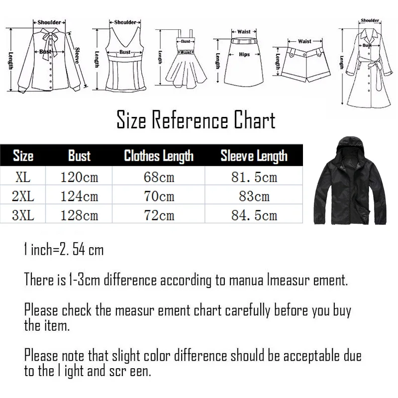 1.All sizes are Asian size, not US/European size, you can choose the size according to your body size.2.As measured by hand,1-3cm difference is allowed(1cm=0.3937inch).3.Different computer screen can display different colors even if it is the same color. So please allow reasonable color difference.4.If you meet any problems,please try to contact us,we are glad to help you deal any problem.