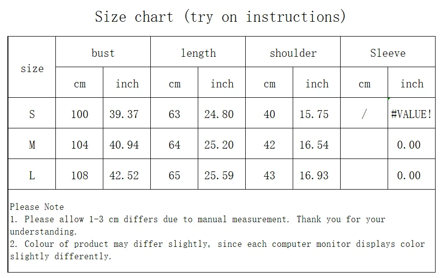 3. Please note that sizes on the chart may differ from manual measurements by 2-3cm.